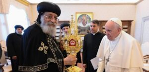 وعن الوحدة المسيحية، أشار قداسة البابا فرنسيس إلى “المبادئ الرائدة لتوجيه البحث في الوحدة بين الكنيسة الكاثوليكية والكنيسة القبطية الأرثوذكسية، والتي قبلها القديس البابا يوحنا بولس الثاني والبابا شنودة الثالث” وأضاف: “وفيها تم التأكيد بكلمات نبوية على أن الوحدة التي نتخيلها لا تعني استيعاب الواحد للآخر أو سيطرة الواحد على الآخر. بل إنها خدمة كل واحد منا لمساعدته على عيش عطاياه الخاصة التي منحه إياها روح الله”.