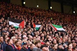تم ورفع علم فلسطين، وتعالت صيحات الجماهير. المنددة بالعدوان الإسرائيلي على قطاع غزة.