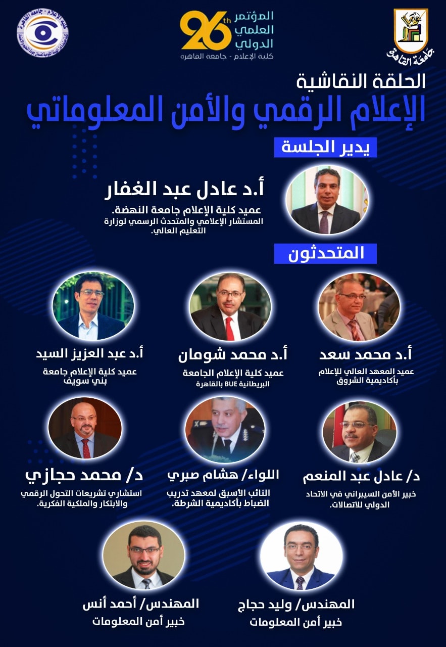 تستضيف كلية الإعلام جامعة القاهرة حلقة نقاشية بعنوان: ” الإعلام الرقمي والأمن المعلوماتي”، وذلك ضمن فعاليات مؤتمرها العلمي السادس والعشرين المقرر عقده يومي 24 و25 مارس المقبل.