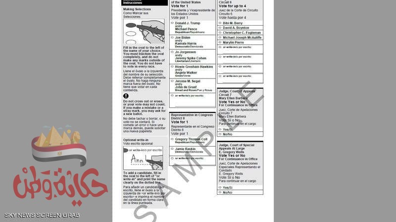 وتتيح الورقة الانتخابية للناخب الأميركي اختيار اسم واحد من المرشحين أو كتابة اسم أي مرشح آخر للرئاسة من غير المدرجين في الورقة وذلك حسب الدستور الأميركي.وفي مقاطعة مونتغومري في ولاية ميريلاند، على سبيل المثال لا الحصر سيتعين على الناخبين اختيار 4 قضاة لمحكمة الدائرة السادسة من بين 6 مرشحين أو كتابة أسماء أربعة من غير المدرجين في الورقة الانتخابية وذلك وفق نموذج لورقة انتخابية حصلت عليها الجريدة.