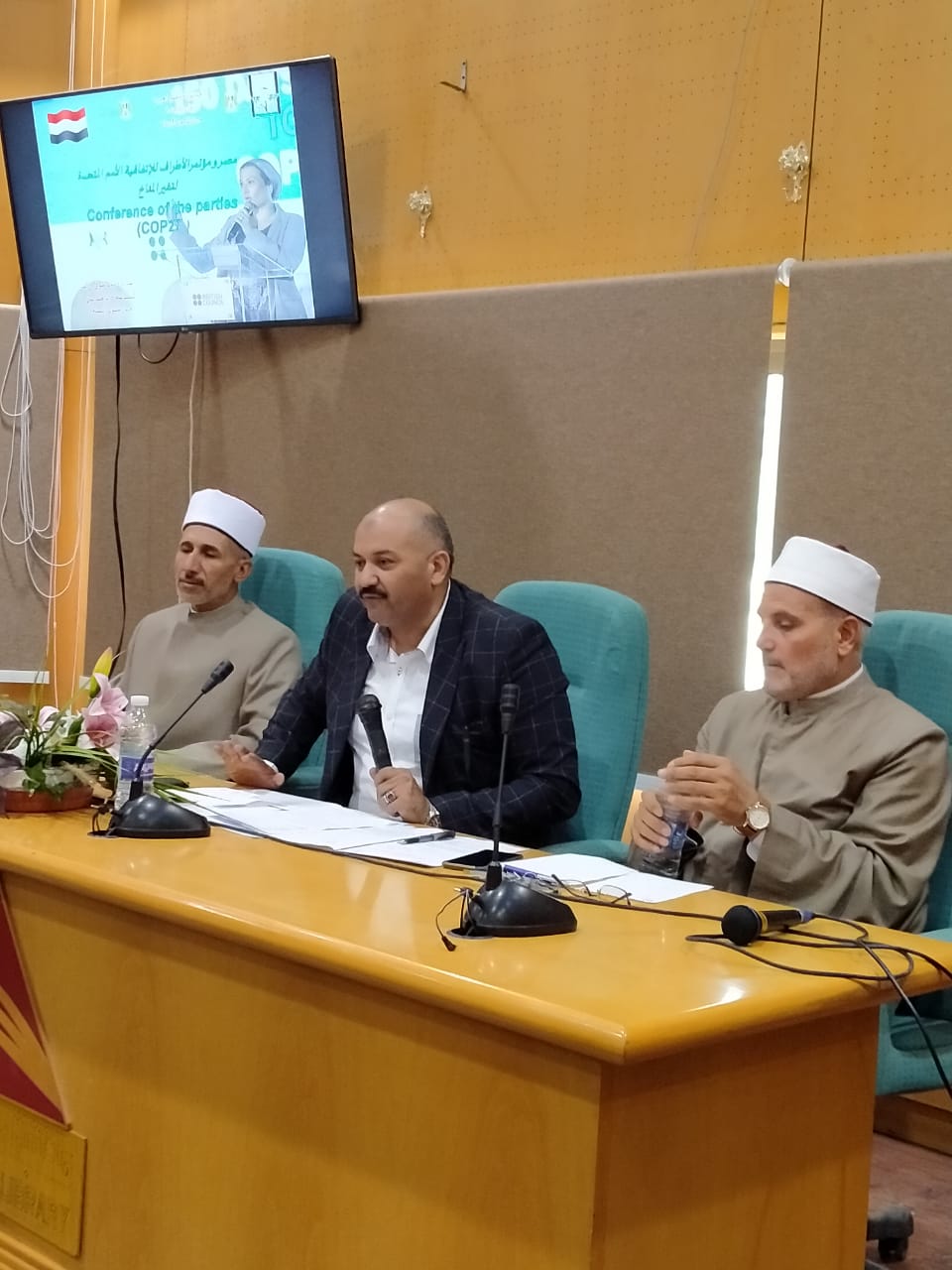 حيث قام السيد الأستاذ/ على جمال عامر دومة- مدير عام جهاز شئون البيئة بالبحيرة بإلقاء الضوء حول المجهودات المبذولة من قبل الدولة ممثلة فى وزارة البيئة للتكيف والتخفيف من حدة الأثار المناخية فى ضوء الإلتزام بالإتفاقيات المنصوص عليها والتى تهدف لحماية كوكب الأرض، فى حين أشار فضيلة الشيخ / نصر الدين شعبان – مدير عام المنطقة الأزهرية بالبحيرة إلى أن حماية البيئة منهج حياة وعقيدة حثت عليها الشريعة الإسلامية، وأن المنطقة الأزهرية بالبحيرة ستتخذ العديد من الإجراءات لنشر التوعية بالقضايا البيئية على مستوى المعاهد والجامعات، كما أن للواعظ دور هام فى التوعية بالمسائل البيئية وأهمية التعامل الإيجابى معها، وهذا ما أكد عليه فضيلة الشيخ / سمير الرجيلى – بمنطقة وعظ البحيرة، وأضاف السيد الدكتور/عبد الباري بصل – استاذ البلاغة والنقض بكلية اللغة العربية التربية فى الأساس من تضع اللبنات الأولى للتعامل مع البيئة بشكل صحيح، أدار الحلقة النقاشية السيد الدكتور/ محمد عاشور – بالمنطقة الأزهرية بمحافظة البحيرة والذى حرص على دعوة رموز الدعوة بالمحافظة لوضع خطة عمل لنشر التوعية بالمسائل البيئية فى ضوء البروتوكول الموقع بين وزارة البيئة والأزهر الشريف، كما قامت الكيميائية / نهاد زايد – بالإدارة البيئية بجهاز شئون البيئة بالبحيرة بتقديم عرض تناول التعريف بتغير المناخ وأسبابه وأثره على القطاعات المختلفة، وبنهاية العرض تم فتح باب المناقشة للسادة الحضور لسماع توصياتهم والتى جاءت على النحو التالى:-