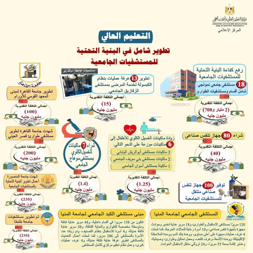 وشهدت جامعة المنصورة أعمال تطوير للبنية التحتية بالمستشفيات الجامعية بتكلفة 235 مليون جنيه، كما تم تطوير مستشفيات جامعة طنطا بتكلفة 235 مليون جنيه.