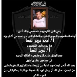 فلقد نعي نادي الالومنيوم نفسه لوفاة الشاب الضاحك دائما و العائله الكريمه