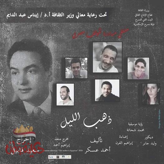 ربما تحتوي الصورة على: ‏‏‏٧‏ أشخاص‏، ‏نص مفاده '‏تحت رعاية معالي وزير الثقافة أ.د إيناس عبد الدايم وزراة الثتافة قطا الإنتاج الشتاتي البيت الفنى للمسرح فرقة مسرح لإسكندرية ذهب الليل إخراج سعيد قابيل مخرج منفذ إبراهيم أجمد auther hea The initiative Fourum رؤية موسيقية محمد شحاتة ديكور إضاءة وليد جابر إبراهيم الفرن تأليف أحمد عسكر 2020‏'‏‏