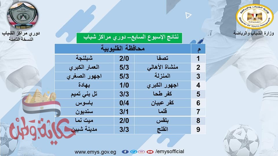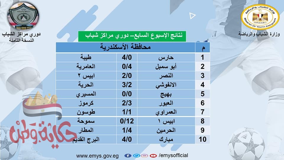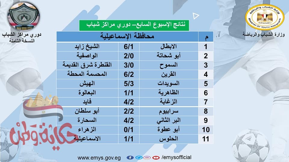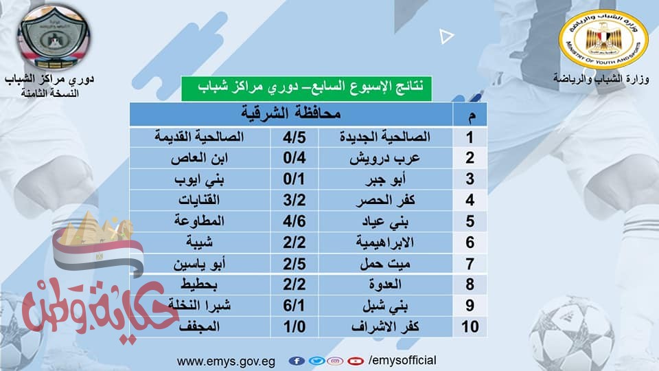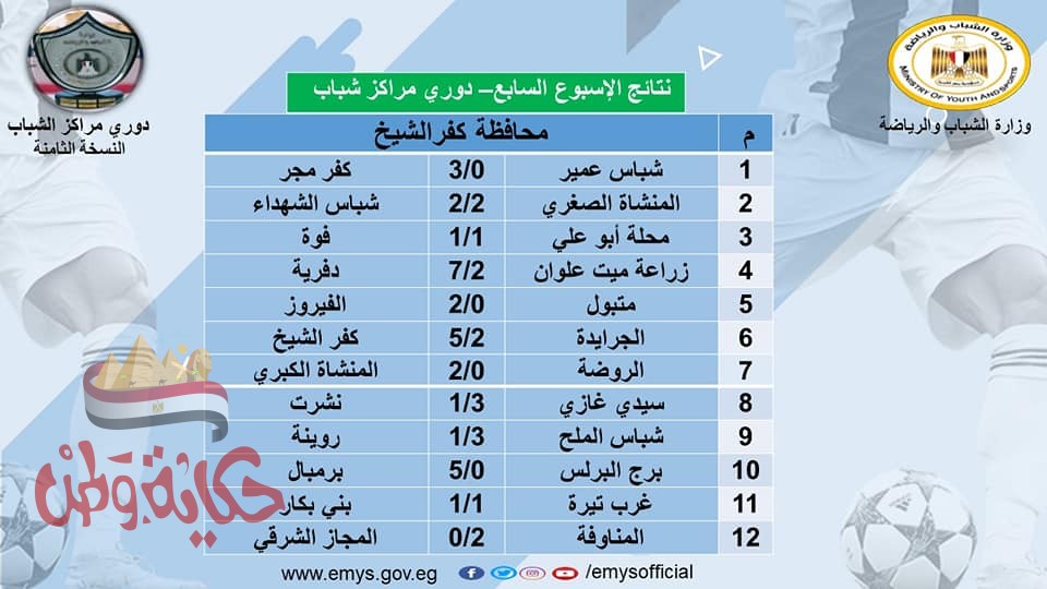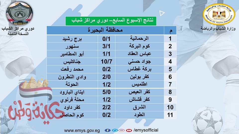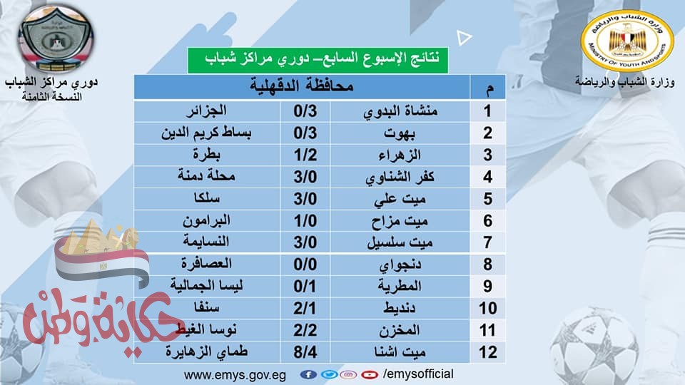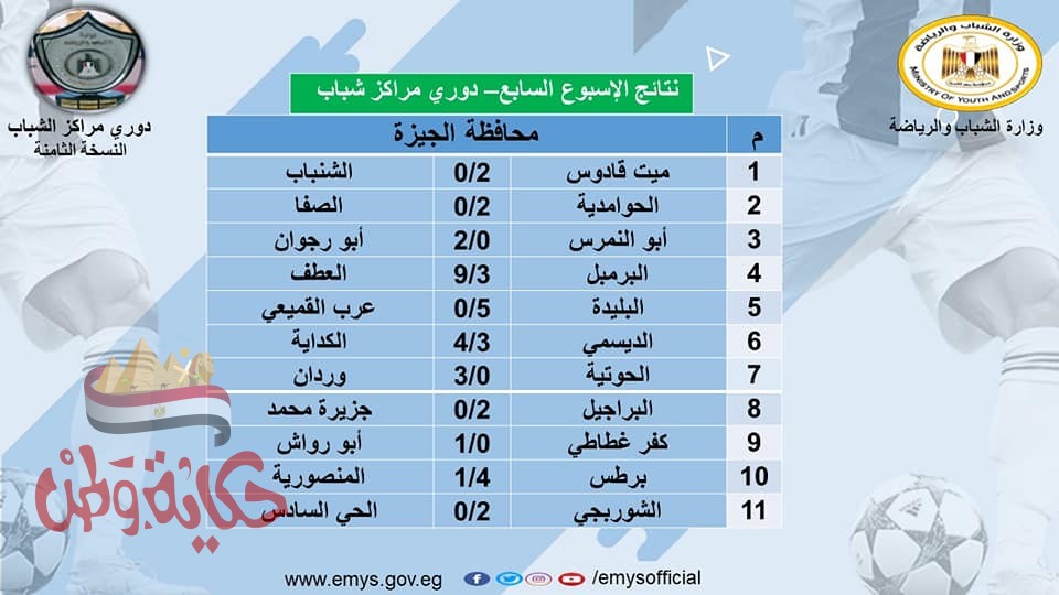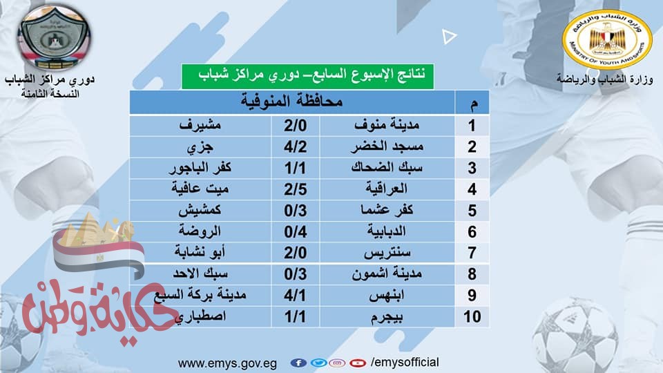 أعلنت وزارة الشباب والرياضة من خلال الإدارة المركزية لمراكز الشباب والهيئات ، نتائج مباريات الإسبوع السابع من دوري مراكز الشباب النسخة الثامنة ،بعد إقامة 239 مباراة في 25 محافظة ، تحت شعار ” مصر أولاً ..لا للتعصب “.