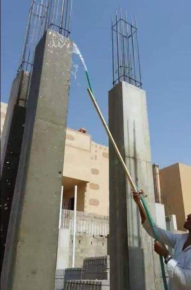 وإهمال وترك خرسانة الأعمدة والميد والقواعد لذلك لابد من رش الماء على أي خرسانة مسلحة بعد الصب وخصوصا في فترة الحر ،