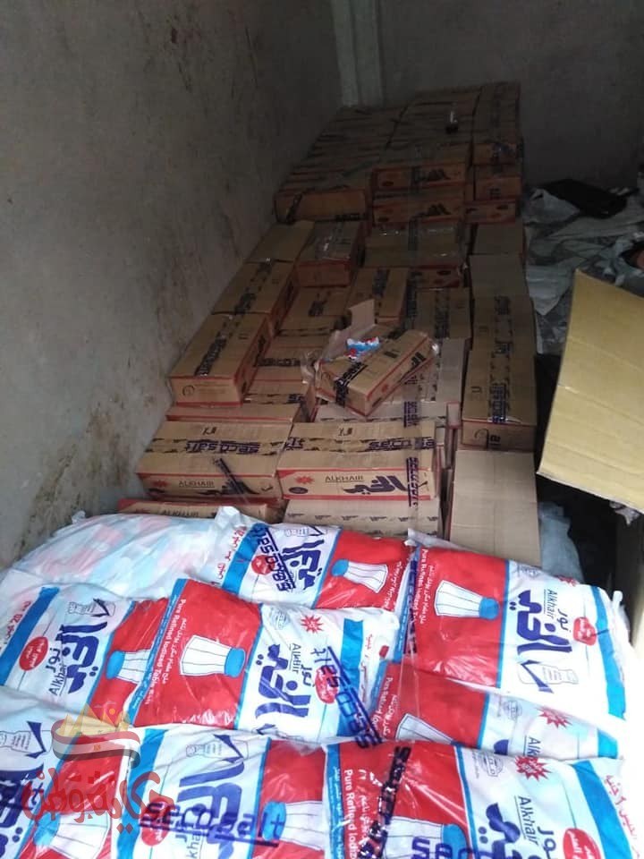 تم ضبط مصنع لتعبئة الملح والتوابل والبهارات بدون ترخيص وبالتفتيش تم ضبط الاتى تم ضبط ٤٨٠ شيكارة ملح متحجرة ونسبة الرطوبة عالية زنة الشيكارة ٢٥ كيلو جرام باجمالى ١٢٠٠٠ كيلو جرام. تم ضبط ١٠٠٠ كرتونة ملح الخير بكل كرتونة عدد ٢٠ كيس زنة الكيس ٢٥٠ جرام استخدام عناوين وهمية وغش تجارى باجمالى ٢٠٠٠٠ كيس . تم ضبط ٢٠٠ كرتونة ملح بونو جولد بكل كرتونة عدد ٢٠ كيس زنة الكيس ٣٠٠ جرام استخدام عناوين وهمية وغش تجارى باجمالى ٤٠٠٠ كيس. تم ضبط ٣٠ كرتونة توابل و بهارات فلفل وكمون و شطة بكل كرتونة عدد ٦ علب ورقية بكل علبة عدد ٥٠ عبوة وغير مدون عليها بيانات باجمالى ٩٠٠٠ عبوة. تم ضبط ٢٠ علبة ثوم بودر بكل علبة عدد عدد ٢٤ كيس زنة الكيس ٤٨٠جرام وغير مدون عليها اى بيانات باجمالى ٤٨٠ عبوة .