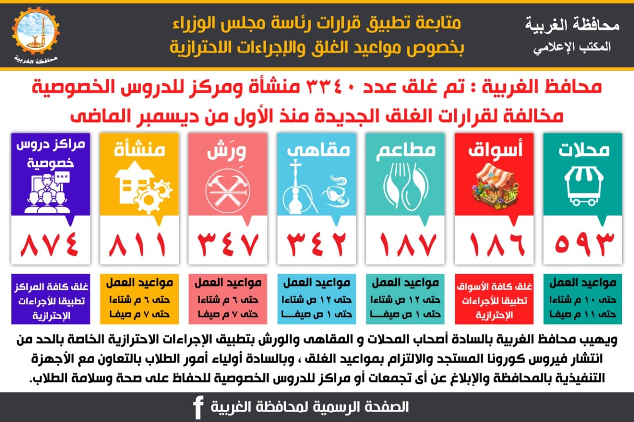 يتابع الدكتور طارق رحمي محافظ الغربية بشكل دوري ومستمر الغلق للمنشآت المخالفة لمواعيد الغلق الجديدة والتي صدرت في الأول من ديسمبر الماضي ، حيث تم غلق عدد (٥٩٣) محل، عدد (١٨٦) سوق، عدد (١٨٧) مطعم، عدد (٣٤٢) مقهى، عدد (٣٤٧) ورشة و (٨١١) منشأة أخرى بإجمالي عدد (٢٤٦٦) منشأة مخالفة بنطاق محافظة الغربية.