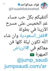 وغرد “عبدالواحد” قائلا: “ألتقيكم بكل الحب مساء غد الخميس على مسرح الأرينا فى بطولة قفزالسعودية، وإن شاء الله تكون ليلة كلها فن معاكم فى الرياض المبهرة”