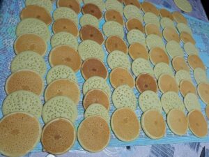 علي نار متوسطة يتم تشكيل العجينه علي شكل دوائر صغيرة أو كبيره في وعاء كبير من الجرانيت أو التيفال ، ويتم التأكد من تمام السواء حين يختفي السائل وتظهر الفقاقيع اعلي العجينه بينما يصفر أسفلها، تكرر العملية لحين الإنتهاء من السائل.