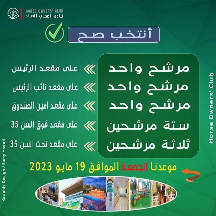 جدير بالذكر أن انتخابات نادي أصحاب الجياد بالاسكندريه تقام يوم الجمعة الموافق 19 مايو الجاري.