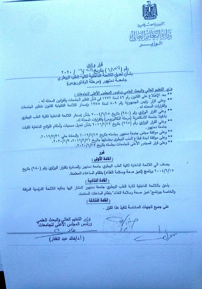 وافق المجلس الاعلى للجامعات بتعديل اللائحة الداخلية لمرحلة البكالوريوس وذلك لإضافة درجة بكارلوريوس العلوم الطبية البيطرية بيرنامج (تميز صحة وسلامة الغذاء )بنظام الساعات المعتمده بكلية الطب البيطري جامعة دمنهور ، حيث تسعى كلية الطب البيطرى بجامعة دمنهور الى التميز فى مجال العلوم الطبية البيطرية محليا واقليميا وعالميا والارتقاء بالعملية التعليمية وبمستوى البحث العلمى وتطويره ليشمل كافة المجالات وخصوصا فى مجال الصحة وسلامه الاغذية ذات الاصل الحيوانى وحماية الانسان من الأمراض والمتبقيات الضارة التى تنتقل إليه من الحيوان ومنتجاته والمخلقات الحيوانيه مع تقديم الحلول المناسبة لها التى تسهم فى تنمية الثروة الحيوانية وهذا لإعداد كوادر بيطرية متميزة ورواد أكفاء فى مجال صحة وسلامة الغذاء والبحث العلمى قادر على نقل المعارف وتوطين التقنية وخدمة وتطوير المجتمع المحلى .