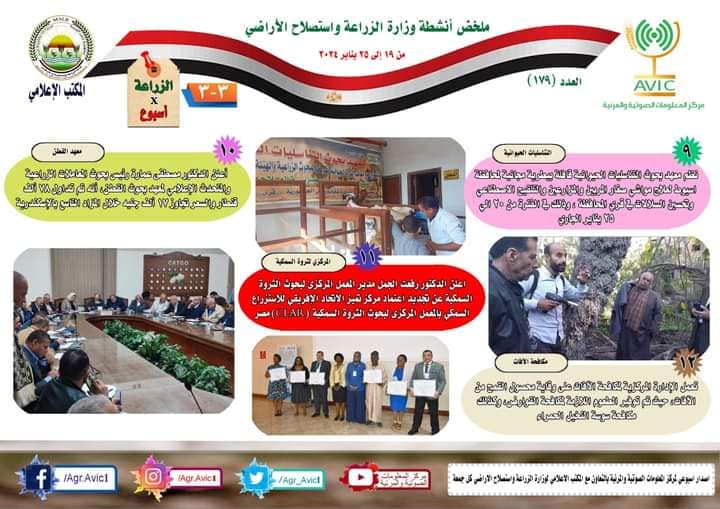 أصدر مركز المعلومات الصوتية والمرئية، التابع لوزارة الزراعة واستصلاح الاراضي، “الانفوجراف الأسبوعي” في نسخته رقم ١٧٩ ، حول الحصاد الأسبوعي لأهم أنشطة الوزارة، خلال الاسبوع الماضي في الفترة من ١٩ وحتى ٢٥ يناير الجاري، وذلك بالتعاون مع المكتب الاعلامي للوزارة، كما أصدر المركز ايضا ملخصا بالفيديو، حول انشطة الوزارة خلال نفس الفترة.