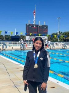 “ملك محمد طليب” ميداليتين، ميدالية ذهبية المركز الاول في سباق 50 متر سباحة بزعانف المونو