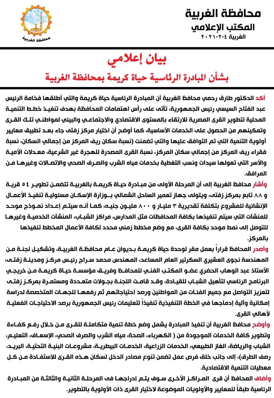 بيان اعلامي بشأن المبادرة الرئاسية حياة كريمة بمحافظة الغربية