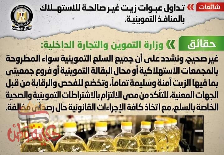 انتشر في بعض المواقع الإلكترونية وصفحات التواصل الاجتماعي أنباء بشأن تداول عبوات زيت غير صالحة للاستهلاك بالمنافذ التموينية، وقد قام المركز الإعلامي لمجلس الوزراء بالتواصل مع وزارة التموين والتجارة الداخلية، والتي نفت تلك الأنباء، مُؤكدةً أنه لا صحة لتداول عبوات زيت غير صالحة للاستهلاك بالمنافذ التموينية، مُشددةً على أن جميع السلع التموينية سواء المطروحة بالمجمعات الاستهلاكية أو محال البقالة التموينية أو فروع جمعيتي بما فيها الزيت آمنة وسليمة تماماً، وتخضع للفحص والرقابة من قبل الجهات المعنية، للتأكد من مدى الالتزام بالاشتراطات التموينية والصحية الخاصة بالسلع، مع اتخاذ كافة الإجراءات القانونية حال رصد أي مخالفة.