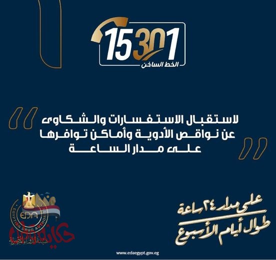 تقديم خدمة تلقي شكاوى واستفسارات المواطنين الخاصة بوجود نواقص الأدوية عن طريق الخط الساخن لهيئة الدواء المصرية “15301″