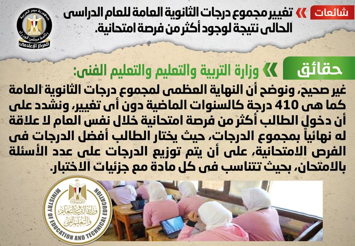 شائعة: تغيير مجموع درجات الثانوية العامة للعام الدراسي الحالي نتيجة لوجود أكثر من فرصة امتحانية