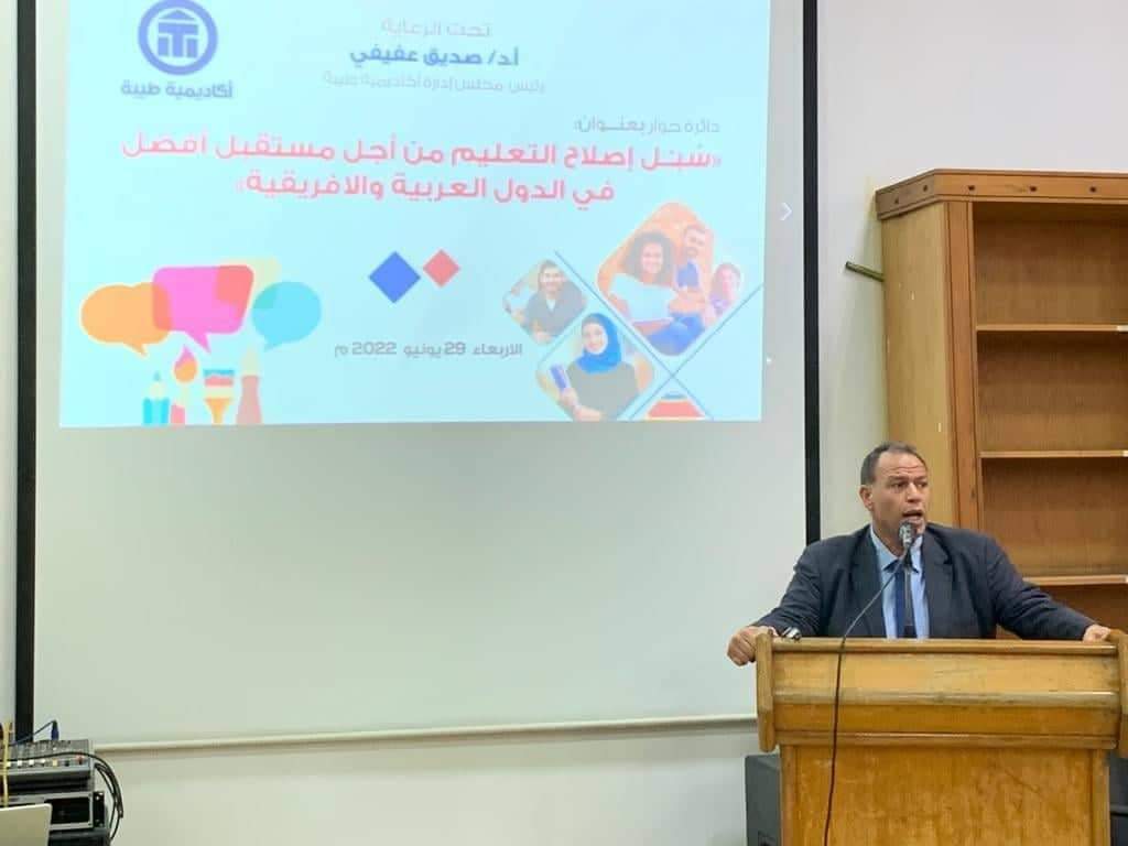 تحدث في بداية ( دائرة الحوار) الاستاذ الدكتور أحمد صديق مساعد رئيس أكاديمية طيبة الذى ترأس الإجتماع نائبا عن الاستاذ الدكتور صديق عفيفي الذي حالت الظروف دون حضوره فأكد أنه تم الاتفاق على عقد هذه دائرة الحوار لإصلاح التعليم الجامعي وقبل الجامعي في الدول النامية بناء على المؤتمر الذي انعقد في شهر مايو الماضي في أكاديمية طيبة ، واشار أن دائرة الحوار تنعقد تحت رعاية الأستاذ الدكتور صديق عفيفي الذي كان من المفترض حضور سيادته لولا ظروف صحية طارئة وأضاف الأستاذ الدكتور أحمد صديق : هدفنا اليوم هو أن نخرج في نهاية هذه الجلسة بتوصيات محددة لإصلاح التعليم في الدول العربية والأفريقية وأن تكون تلك التوصيات بناءة وقابلة للتطبيق الفعلي وان تكون توصيات لمواجهة ما هو موجود من تحديات حقيقية في تلك الدول.