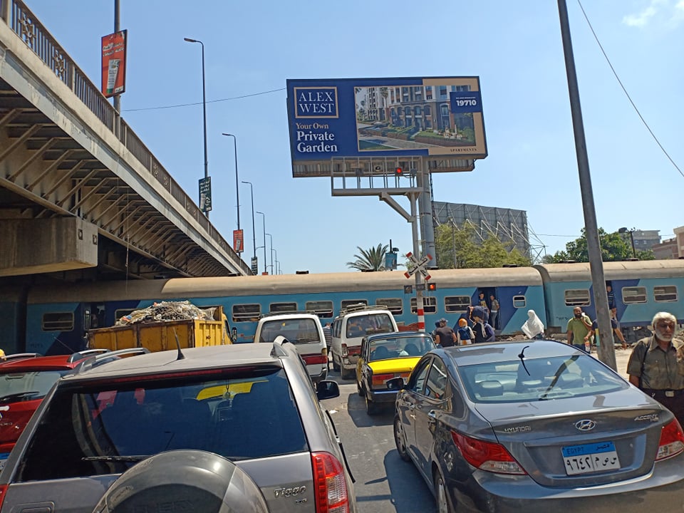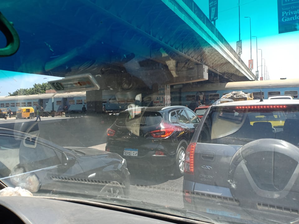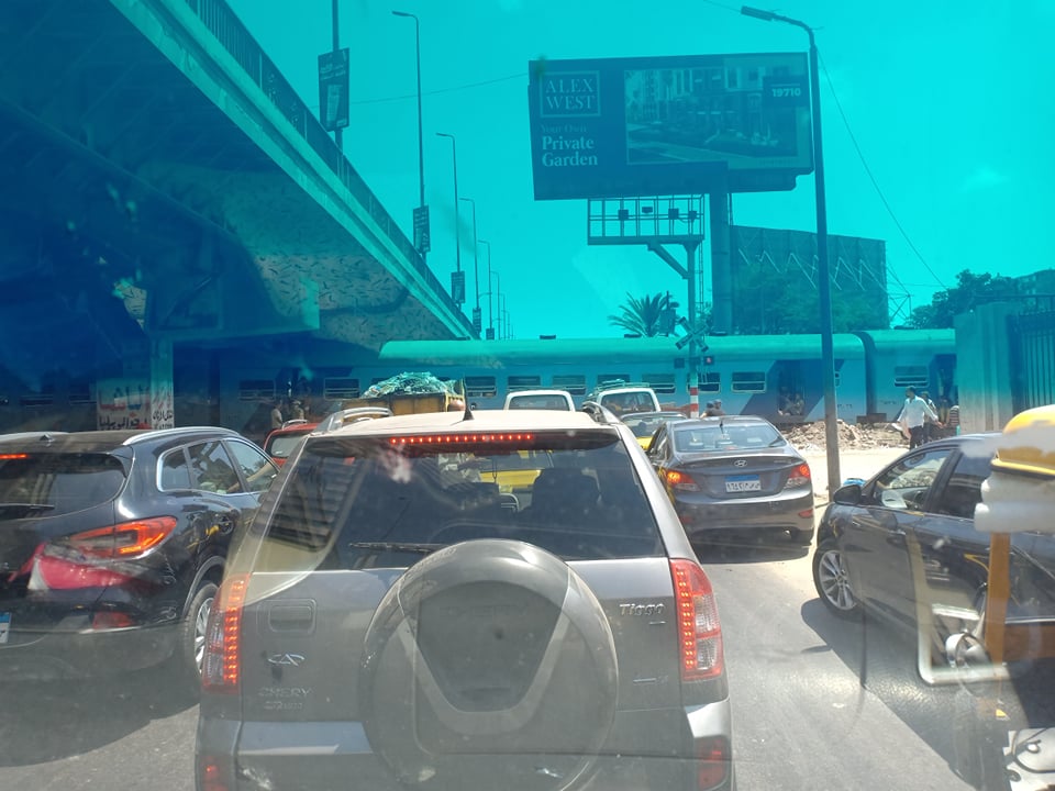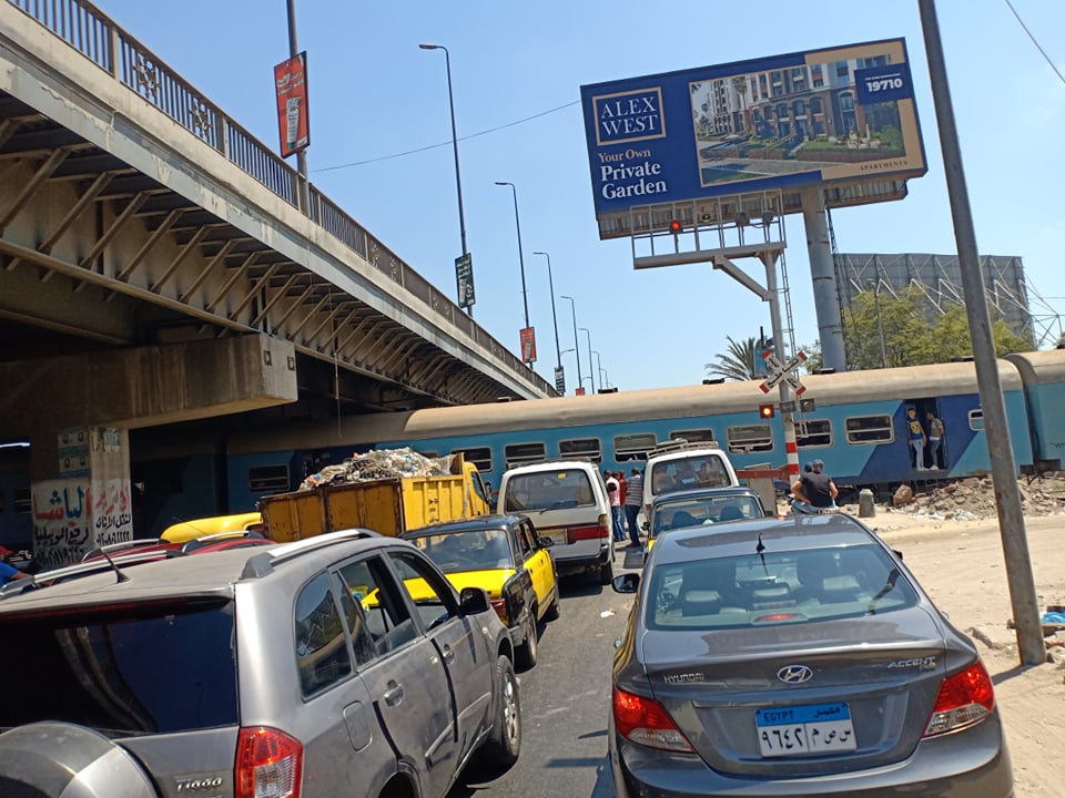توقف قطار مطروح بالاشارة يؤدي إلي توقف حركة السيارات وتكدس مروري علي جانبي الطريق من مزلقان و كوبري محرم بك