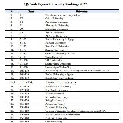 جاء ذلك خلال تصريح الأستاذ الدكتور محمد سعيد أبو الغار، ، بأن الجامعة ظهرت بتــصنـيـــــف كيــــــــو إس البــــريطــــانـــــى للـــــــدول العــــربــيـــــــة QS Universities Rankings: Arab Region لعــــام 2022، حيـــــث احتـــــلت الجــامعـــة التـــرتيــــب 111-120 من بين أفضل 181 جامعة على مستوى العالم العربى.