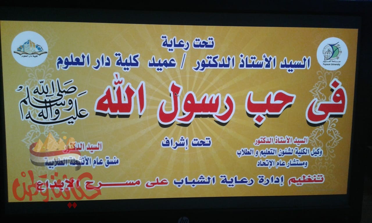 تحت رعاية أ.د أحمد جابر شديد رئيس جامعة الفيوم وإشراف أ.د إمام عبد الفتاح عميد كلية دار العلوم نظمت الكلية احتفالية تحت عنوان (في حب رسول الله) بمسرح الإبداع بالكلية، احتفالًا بذكرى مولد النبي صلى الله عليه وسلم، وذلك اليوم الموافق ٢٧ أكتوبر ٢٠٢٠ بحضور أ.د صلاح العشيري وكيل الكلية لشئون التعليم والطلاب وأ.د وليد سعيد شيمي وكيل الكلية لشئون خدمة المجتمع وتنمية البيئة وأ.د محمد عجيلة وكيل الكلية لشئون الدراسات العليا والبحوث وعدد من أعضاء هيئة التدريس والعاملين بالكلية والطلاب الحاضرين.