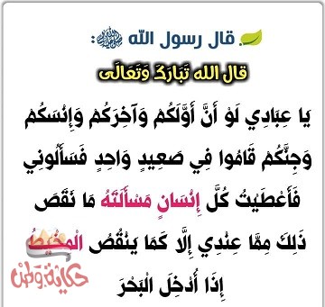 « يَا عِبَادِي لَوْ أَنَّ أَوَّلَكُمْ وَآخِرَكُمْ وَإِنْسَكُمْ وَجِنَّكُمْ قَامُوا فِي صَعِيدٍ وَاحِدٍ فَسَأَلُونِي فَأَعْطَيْتُ كُلَّ إِنْسَانٍ مَسْأَلَتَهُ ، مَا نَقَصَ ذَلِكَ مِمَّا عِنْدِي إِلَّا كَمَا يَنْقُصُ الْمِخْيَطُ إِذَا أُدْخِلَ الْبَحْرَ » .