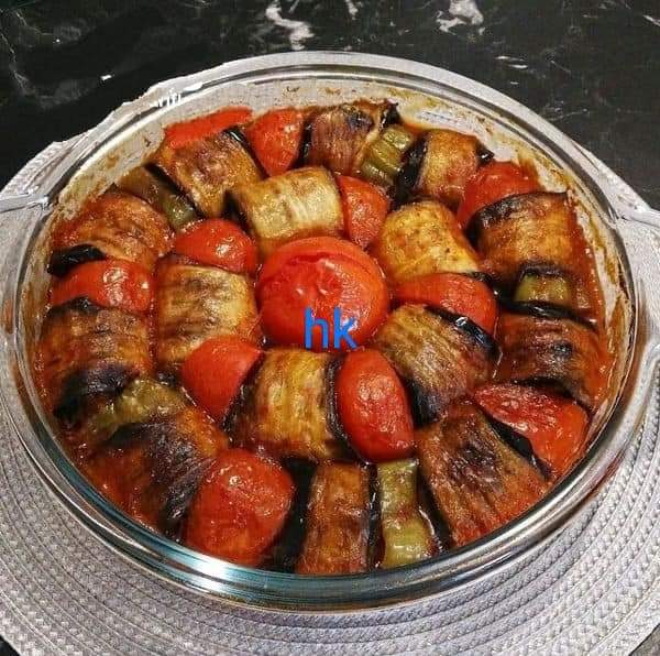 نقطع الفلفل إلى قطع صغيرة ونقوم بترتيب البدنجان وشرائح الطماطم والفلفل بجانب بعضهم وفى المنتصف نضع حبة طماطم