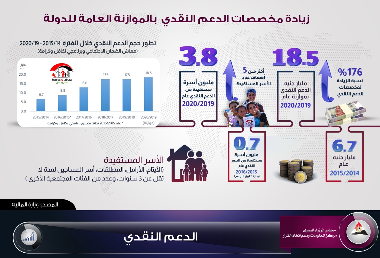 نشر مركز المعلومات ودعم اتخاذ القرار إنفوجرافيك بعنوان زيادة مخصصات الدعم النقدي بالموازنة العامة للدولة ؛ حيث تولي الحكومة المصرية اهتمامًا كبيرًا بالفئات الأولى بالرعاية،