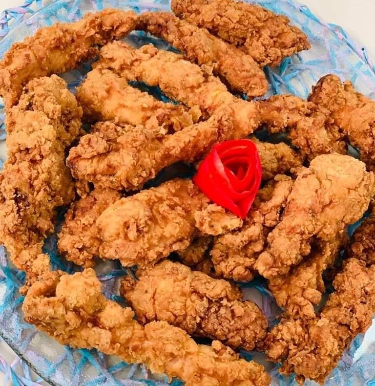 نخلط كل البهارات مع بعض جيداً ثم نقطع صدور الدجاج شرائح سميكة ونضع عليها نصف كمية البهارات ثم الكاتشب ونخلط جيداً و نتركها في التتبيلة لمدة ساعتين في الثلاجة ثم في بولة نخلط كل مكونات الخلطة ونقلب جيداً حتى يصبح الخليط متجانس ثم في بولة أخرى نخلط كل مكونات التغطية النشا ثم نأخذ قطعة الدجاج وننزلها في الخلطة ثم التغطية ونضعها في طبق ونكرر العملية حتى تنتهي الكمية ثم نقليها في زيت غزير ساخن حتى تحصل على لون ذهبي وتقدم بالهنا والشفا