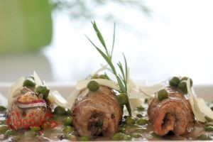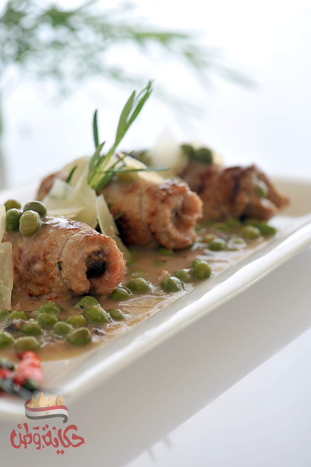 – تُفرد شريحة اللحم، وتُوضع كمية قليلة من خليط البازيلاء على أحد طرفي اللحم وتُلف، ولإحكام لفها تُقفل باستخدام خلة (عود أسنان) في نهاية قطعة اللحم.