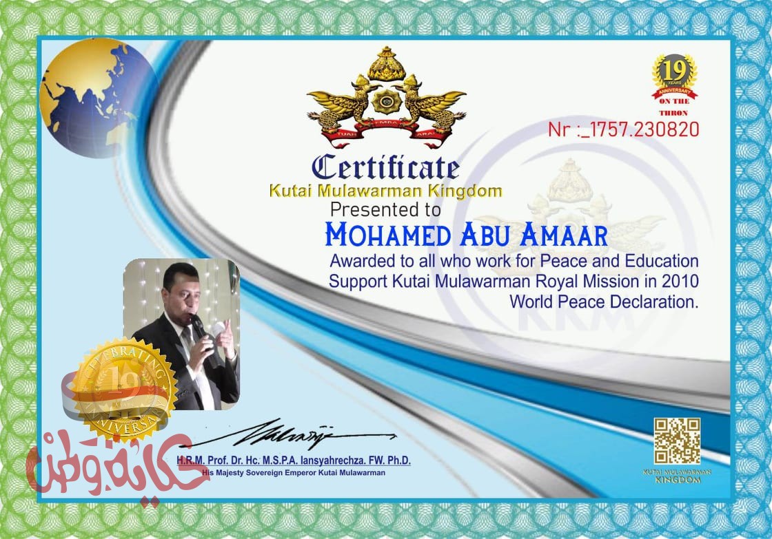 منحتها له الأكاديمية الدوليه للسلام والحريات نيابة عن جلالة الملك كوتاي ملك إندونيسيا