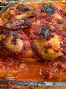 حطي علي البطاطس الصلصه وعليهم الفراخ المتبله وغطيها بورق فويل وعلي الفرن علي اعلي درجه حراره لمده ربع ساعه وبعدين شيلي الفويل عشان الفراخ تاخد وش