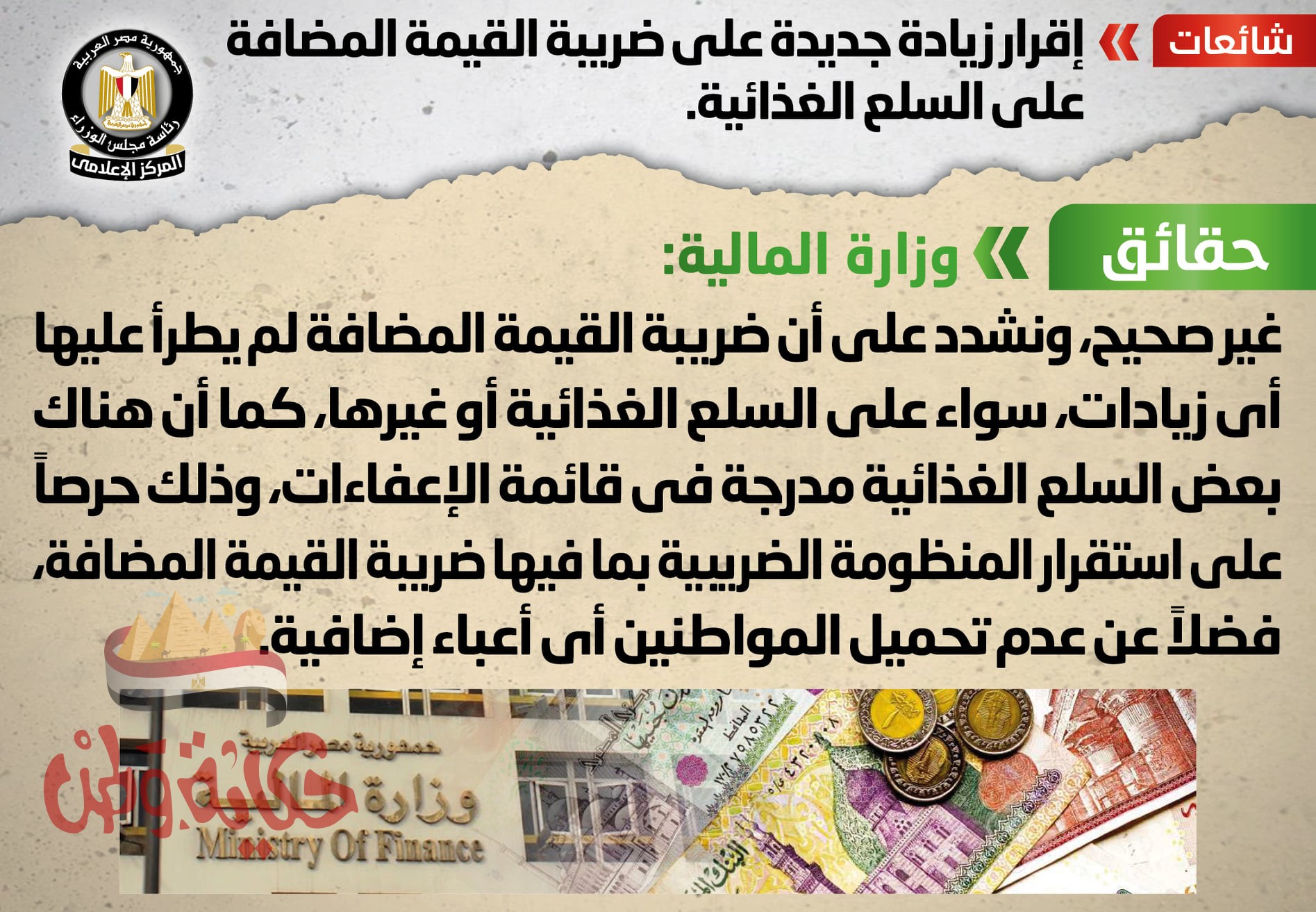 المركز الإعلامي لمجلس الوزراء ينفى شائعة إقرار زيادة جديدة على ضريبة القيمة المضافة على السلع الغذائية
