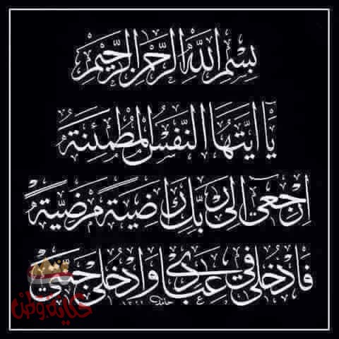 (يَا أَيَّتُهَا النَّفْسُ الْمُطْمَئِنَّةُ * ارْجِعِي إِلَى رَبِّكِ رَاضِيَةً مَرْضِيَّةً * فَادْخُلِي فِي عِبَادِي * وَادْخُلِي جَنَّتِي)