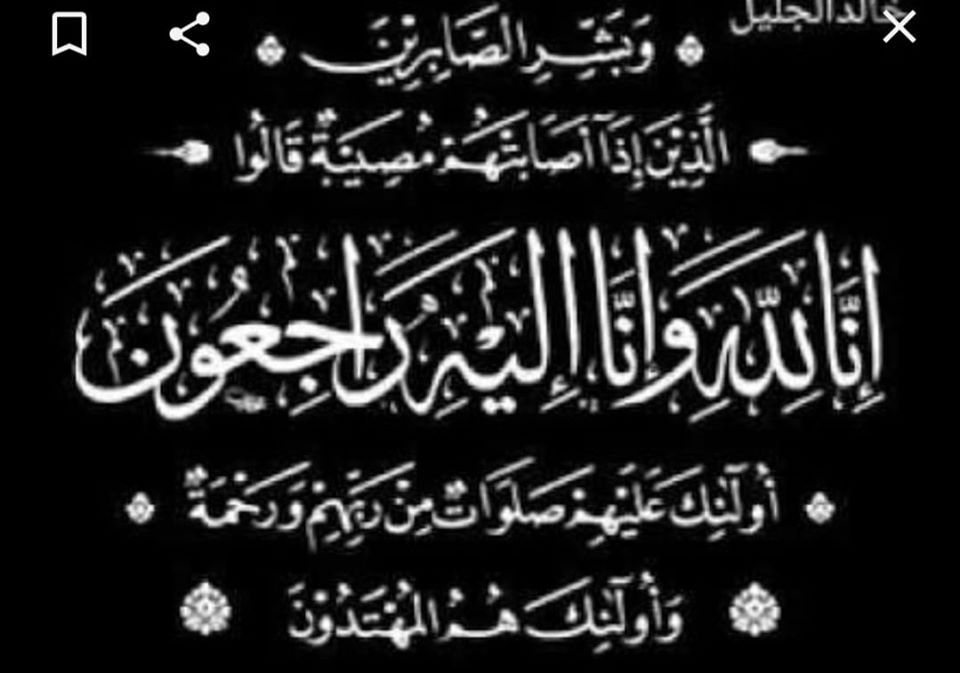 بمزيد من الحزن والأسى تلقينا نبأ وفاة فقيدتكم المغفور لها بإذن الله تعالى ولا يسعنا إزاء مصابكم الأليم إلا أن نتقدم إليكم بصادق المواساة تغمدها الله بواسع رحمته وأسكنها فسيح جناته وألهمكم جميعاً الصبر والسلوان إنا لله وإنا إليه راجعون نشاطركم الأحزان للفقيدة الرحمة ولكم من بعدها طول البقاء إنا لله وإنا إليه راجعون نسأل المولى أن يمن على الفقيدة بالرحمة والرضوان ولكم من بعدها الصبر والسلوان إنا لله وإنا إليه راجعون.
