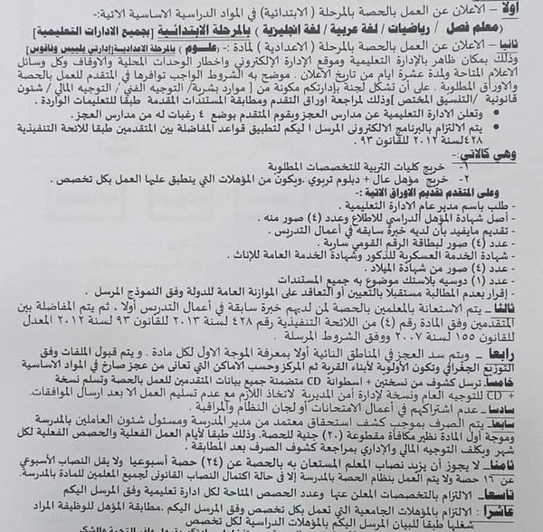 وافق الأستاذ الدكتور ممدوح غراب محافظ الشرقية على فتح باب العمل بـــ نظام الحصة بمدارس المرحلة الإبتدائية بجميع الإدارات التعليمية للعام الدراسي 2021/2022 في مواد (معلم فصل / رياضيات / لغة عربية / لغة انجليزية ) والمرحلة الإعدادية في مادة العلـــوم بإدارتي بلبيس وفاقوس وذلك لصالح العمل والعملية التعلمية وسدا للعجز في تلك التخصصات المطلوبة.