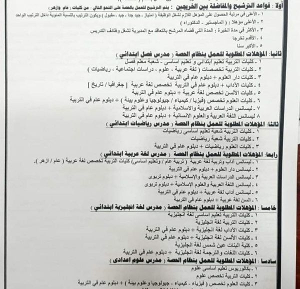 · خريج مؤهل عال + دبلوم تربوي .ويكون من المؤهلات التي ينطبق عليها العمل بكل تخصص لافتا إلى أنه على المتقدم تقديم الأوراق الأتية :-