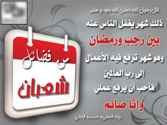 قُلتُ : يا رَسُولَ اللهِ ، لَمْ أَرَكَ تَصُومُ شَهْرًا مِنَ الشُّهُورِ ما تَصُومُ مِنْ شعبان قال : ” ذَلِكَ شَهْرٌ يَغْفُلُ النَّاسُ عَنْهُ بَيْنَ رَجَبٍ وَرَمَضَانَ ، وَهُوَ شَهْرٌ تُرْفَعُ فِيهِ الأَعْمَالُ إِلَى الله ، فَأُحِبُّ أَنْ يُرْفَعَ عَمَلِي وَأَنَا صَائِمٌ ” رواه النسائي ” ، وحسنه الألباني.