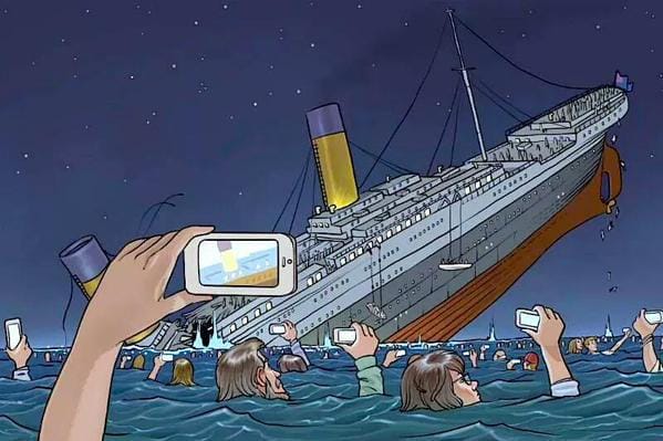 وبعد قيادة القبطان الجديد باع قوارب النجاه بحجة الاحتياجات للنقود، وتصادم في الجزر المحيطه حتي أصيبت السفينه بثقوب حتي تغرق شئ فشئ وللعجب لم يتكلم الركاب هذه المره حتي أوشكت السفينه علي الغرق داخل البحر لكن الركاب كل مافعلوه أخرجو هواتفههم من جيوبيهم ويصورون ما يحدث وبعضهم غارق في البحر