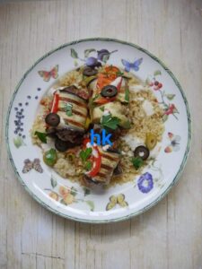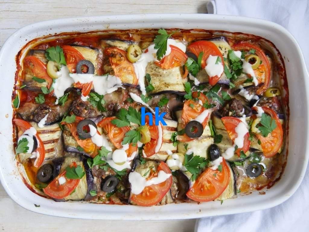 ثم نغطي طبق الفرن بمكعبات الطماطم.ونقوم بتشكيل اللحم المفروم الى كرات ثم ناخذ شريحة من الباذنجان ونلفة حول اللحم المفروم وشرائح الباذنجان لأن هناك القليل من اللحم المفروم في لفة واحدة. ضع كل اللفائف في طبق الخبز.