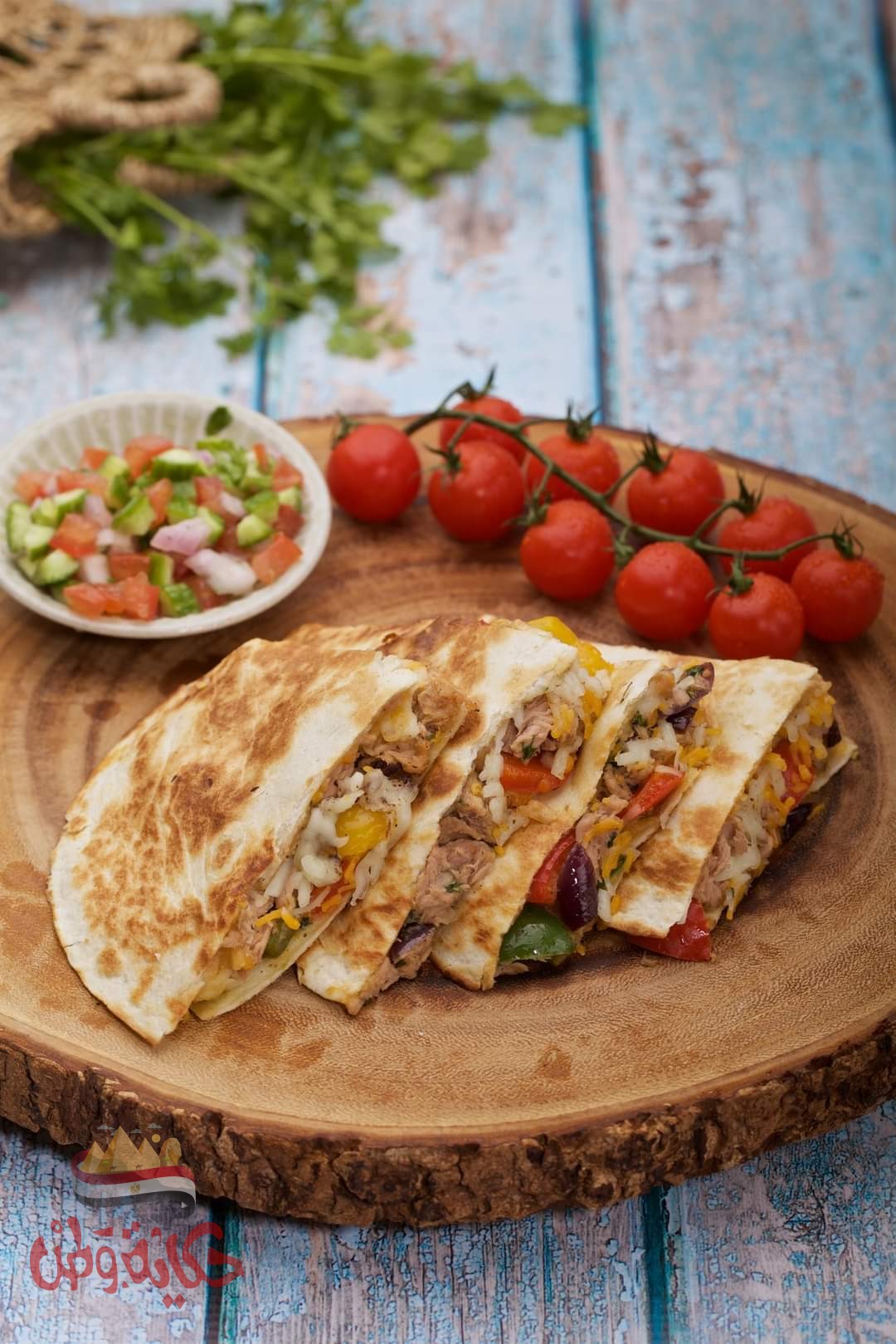 – تُدهن مقلاة بقليل من الزيت وتُسخن على نار متوسطة، توضع التورتيا لحوالي 3 دقائق لكل جانب مع الضغط الخفيف حتى تحمر قليلا ويسيل الجبن.