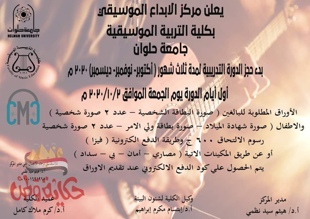 ينظم مركز الإبداع الموسيقى بكلية التربية الموسيقية بجامعة حلوان دورات تدريبية جديدة، تحت رعاية الأستاذ الدكتور ماجد نجم رئيس الجامعة وريادة الأستاذ الدكتور حسام رفاعي نائب رئيس الجامعة لشئون خدمة المجتمع وتنمية البيئة ، وإشراف الأستاذ الدكتور كرم ملاك عميد الكلية ، والأستاذة الدكتورة ابتسام مكرم وكيل الكلية لشئون خدمة المجتمع وتنمية البيئة ، والأستاذ الدكتور هيثم نظمي مدير المركز.