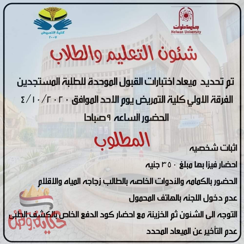 أعلنت كلية التمريض جامعة حلوان عن موعد إجراء اختبارات القبول الموحدة للطلاب المستجدين الفرقة الأولى للعام الجامعي ٢٠٢٠ /٢٠٢١ وذلك تحت رعاية الأستاذ الدكتور ماجد نجم رئيس الجامعة والأستاذة الدكتورة صفاء صلاح عميد كلية التمريض.