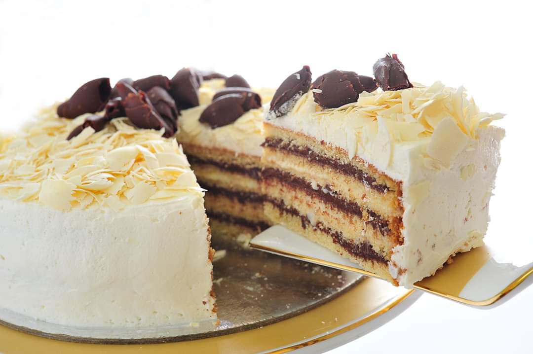 يُغطى سطح الكيك والجوانب بالشكولاتة السائلة البيضاء وتُساوى، وتُزيين بشرائح الشكولاتة الداكنة والبيضاء، وتُقدم.