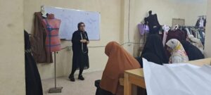التي تدرب مجموعتها على التطريز علي القماش .والاساذة ولاء شومان تعلم إعادة التدوير وشغل الهاند ميد