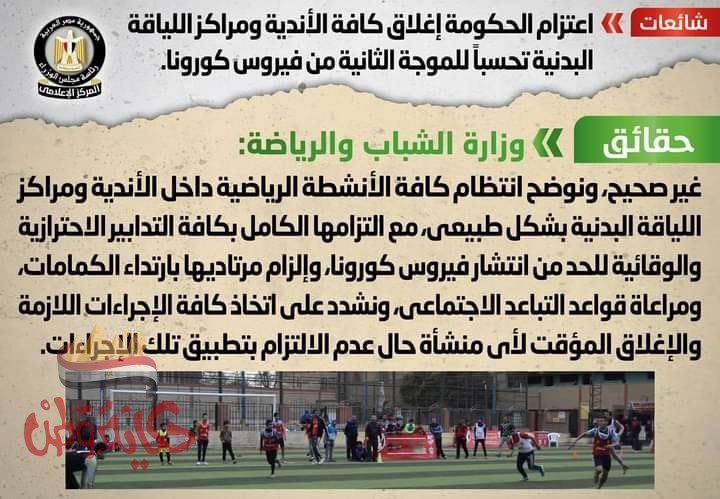 تداولت بعض وسائل الإعلام والمواقع الإلكترونية وصفحات التواصل الاجتماعي أنباء بشأن اعتزام الحكومة إغلاق كافة الأندية ومراكز اللياقة البدنية تحسباً للموجة الثانية من فيروس كورونا، وقد قام المركز الإعلامي لمجلس الوزراء بالتواصل مع وزارة الشباب والرياضة، والتي نفت تلك الأنباء، مُؤكدة أنه لا صحة لإغلاق كافة الأندية ومراكز اللياقة البدنية تحسباً للموجة الثانية من فيروس كورونا، مُوضحةً انتظام كافة الأنشطة الرياضية داخل الأندية ومراكز اللياقة البدنية بشكل طبيعي، مع التزامها الكامل بكافة التدابير الاحترازية والوقائية للحد من انتشار فيروس كورونا، وإلزام مرتاديها بارتداء الكمامات، ومراعاة قواعد التباعد الاجتماعي، مُشددةً على اتخاذ كافة الإجراءات اللازمة والإغلاق المؤقت لأي منشأة حال عدم الالتزام بتطبيق تلك الإجراءات.