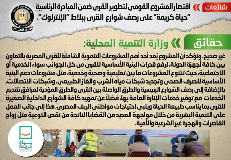 حيث قام  المركز بالتواصل مع وزارة التنمية المحلية، والتي نفت تلك الأنباء، مُؤكدةً أنه لا صحة لاقتصار المشروع القومي لتطوير القرى ضمن المبادرة الرئاسية “حياة كريمة” على رصف شوارع القرى ببلاط “الإنترلوك”،