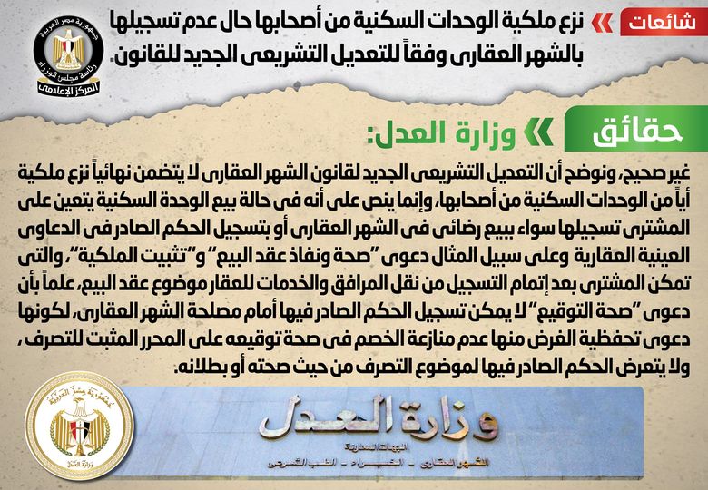 حيث قام  المركز بالتواصل مع وزارة العدل، والتي نفت تلك الأنباء، مُؤكدةً أنه لا يتم نزع ملكية الوحدات السكنية من أصحابها حال عدم تسجيلها بالشهر العقاري وفقاً للتعديل التشريعي الجديد للقانون، مُوضحةً أن التعديل التشريعي الجديد لقانون الشهر العقاري لا يتضمن نهائياً نزع ملكية أياً من الوحدات السكنية من أصحابها، وإنما ينص على أنه في حالة بيع الوحدة السكنية يتعين على المشتري تسجيلها سواء ببيع رضائي في الشهر العقاري أو بتسجيل الحكم الصادر في الدعاوى العينية العقارية