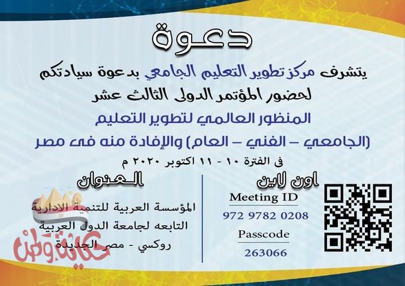 وذلك تحت رعاية وزارة التعليم العالى والبحث العلمى و وزارة القوى العاملة و وزارة الدولة للانتاج الحربي و وزارة الصناعة و صندوق تطوير التعليم التابع لرئاسة مجلس الوزراء – أكاديمية البحث العلمى والتكنولوجيا – المنظمة العربية للتنمية الإدارية التابعة لجامعة الدول العربية. و يعقد المؤتمر بتقنية الفيدو كونفرنس تحت بعنوان: المنظور العالمي لتطوير منظومة التعليم (الجامعي – العام – الفني) والافاده منه في مصر.